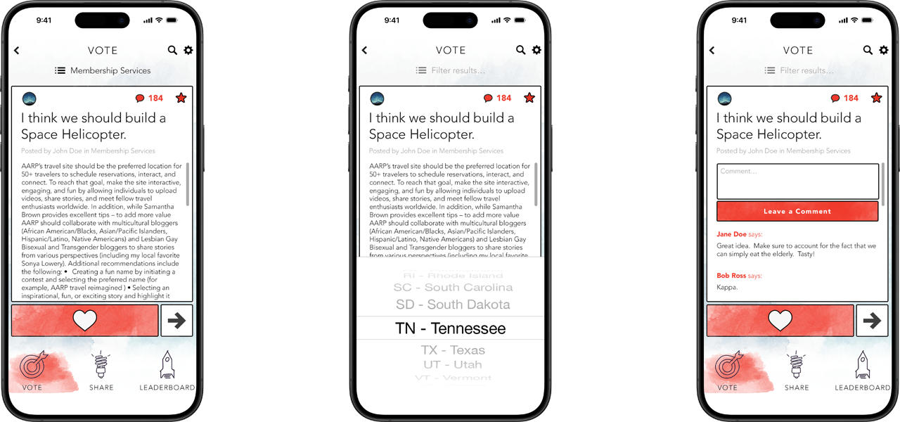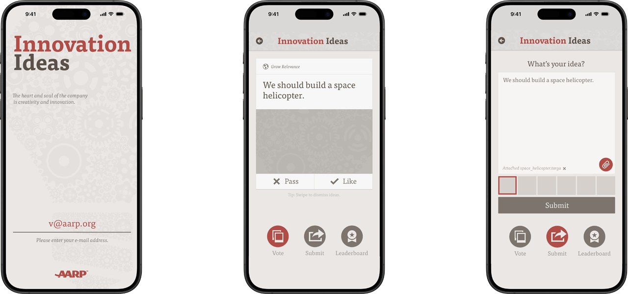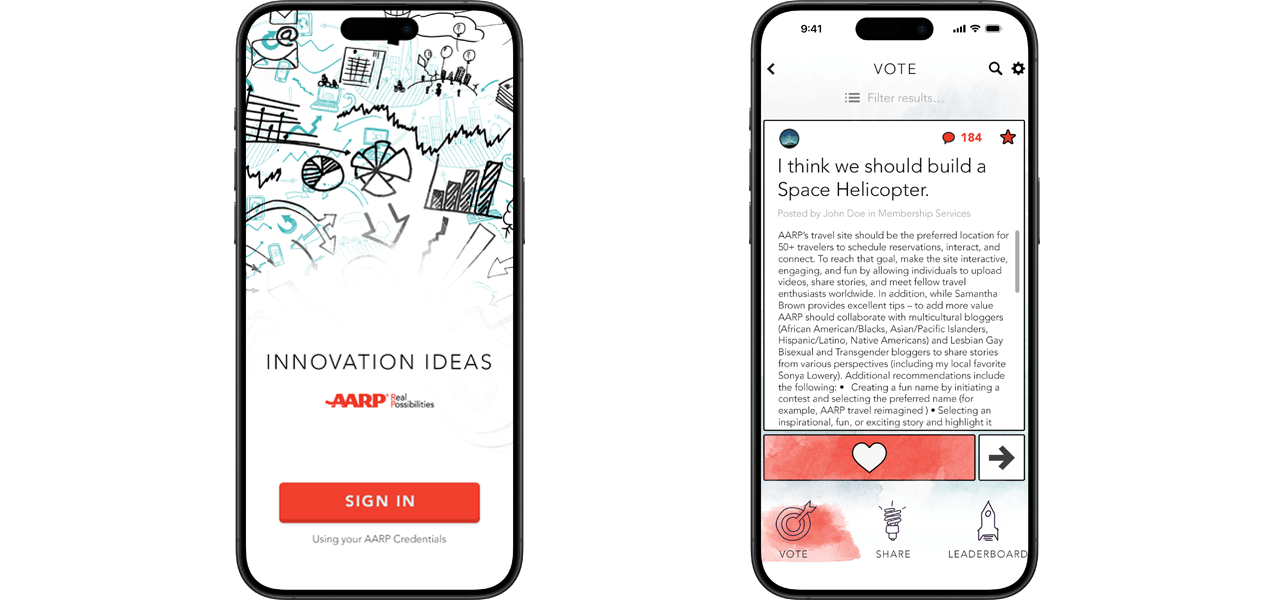 As part of a greater push to involve all of AARP’s employees in the organization’s progress, we were asked to create a mobile application that would allow people to submit and vote on innovative new ideas.