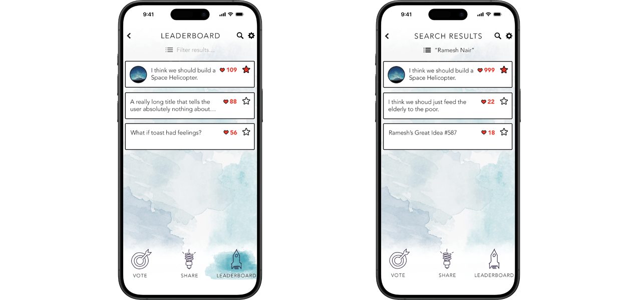 The application had to allow people to quickly submit your ideas (having a “lightbulb moment” in the shower was a frequently mentioned use case), it had to allow people to vote on others’ ideas, and it had to feature a leaderboard where you can see the top-rated ideas each week.