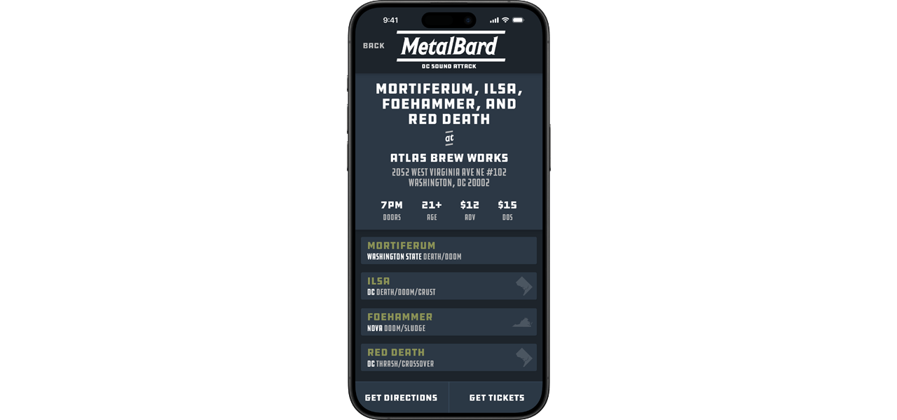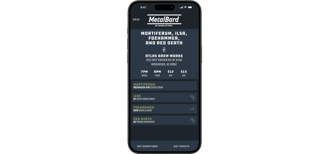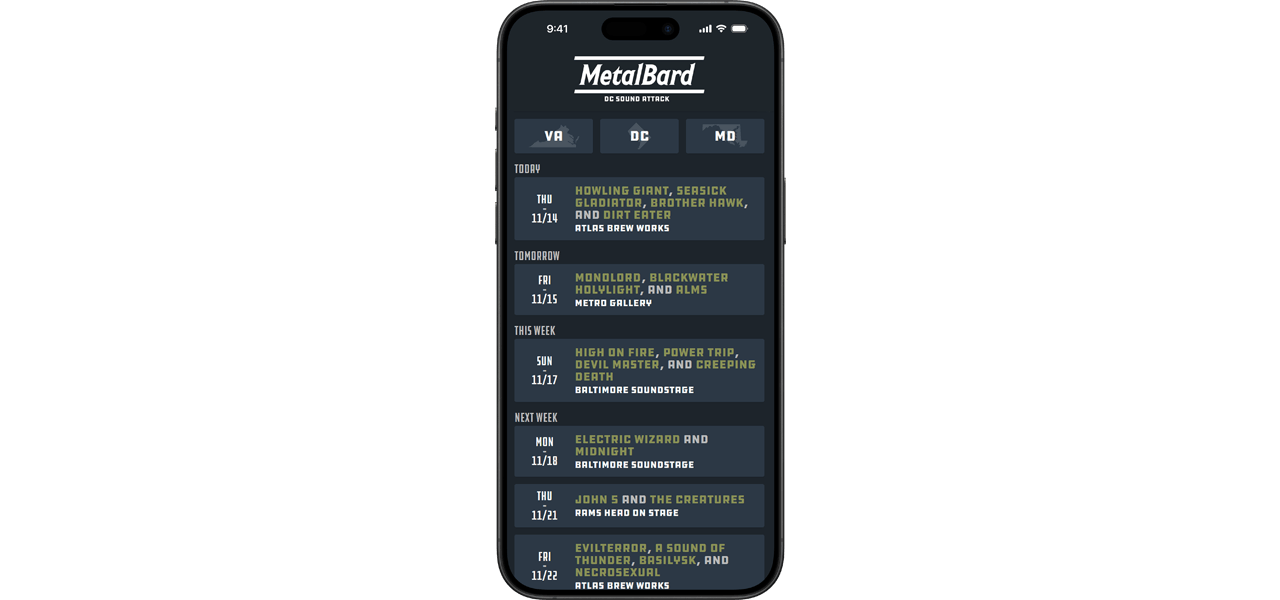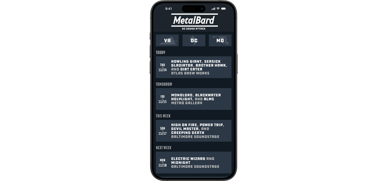 MetalBard is a personal pet project of mine. I’ve gone to about a hundred different metal concerts of every stripe, often several in one week, and I always had to check multiple sources to figure out when a show was coming up, who was playing, and where. Since I was a teenager, spending a night out at a DC-area metal show was one of my most cathartic escapes and one of the few places I felt I belonged, so in a way MetalBard is my way of giving back to that community.